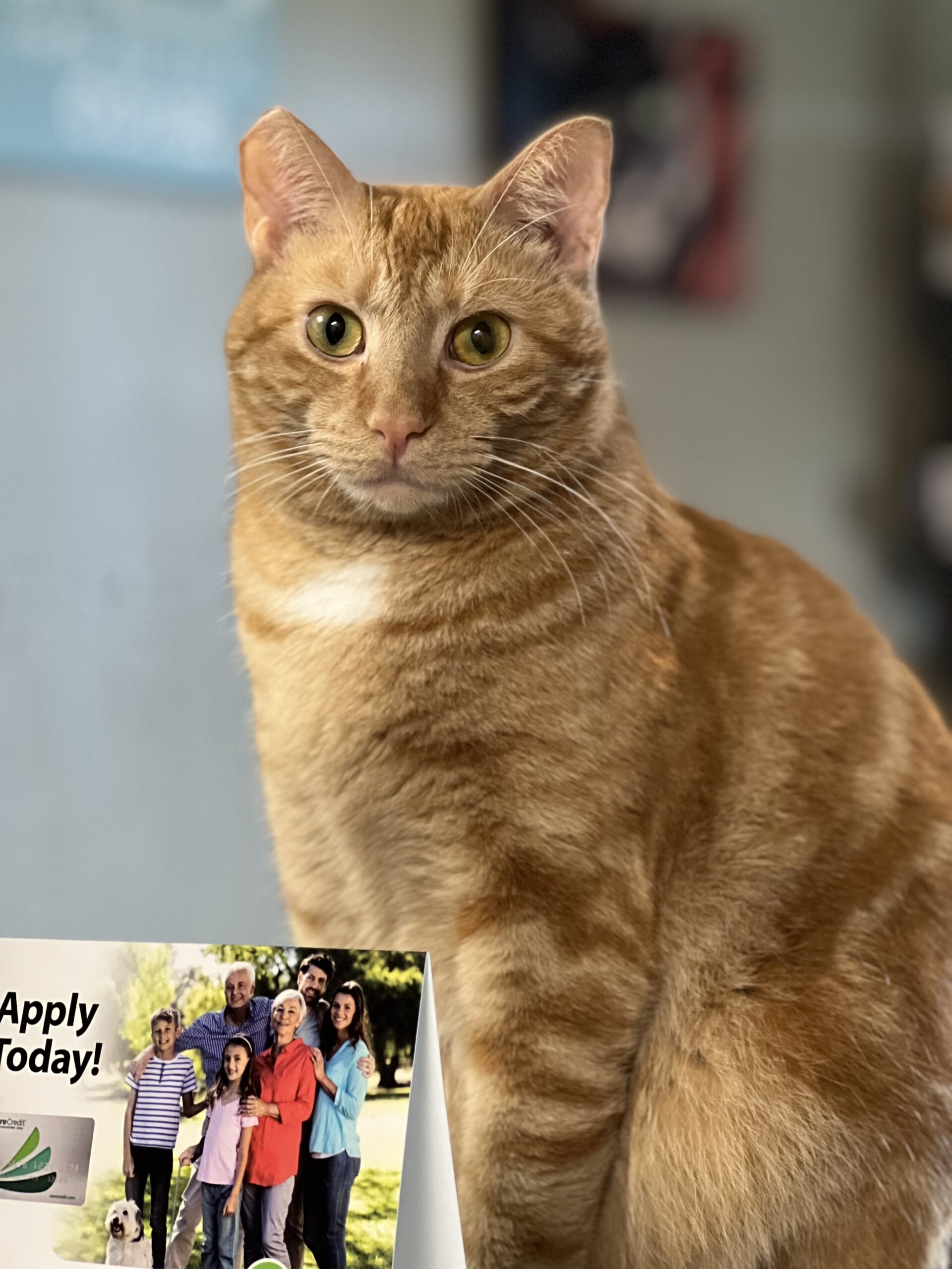 Around the time we were opening our practice, we received a call from an acquaintance about a property that was foreclosed on with a large colony of cats. The realtor working to prepare the property for sale was planning on using rat poison, which would have also poisoned the cats. We worked quick to collect as many cats and kittens as we could who we then provided care to and adopted out. Among these cats was Pappi who couldn’t quite find a home, so he was adopted by us to be a clinic cat.